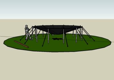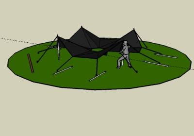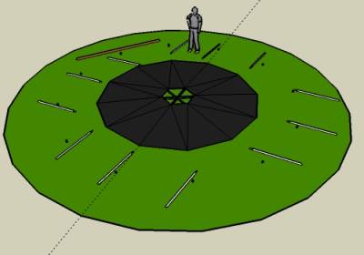 Lege alle benötigten Teile auf der Wiese aus. Das Dach so, wie die Jurte später stehen soll, die Heringe, Seile, Aufstellstangen außen herum, entsprechend an jede Ecke. Die Heringe kannst du in ca. zwei Meter Abstand zu den Ecken gleich einschlagen. Achte dabei auf die Flucht der Linien, so dass später das Seil die gerade Verlängerung der Naht im Dach darstellt. Hier könnt ihr auch gut die Stangen zur Hilfe nehmen, legt diese an die Zeltkante der Seilverbindung und setzt den Hering ans ende von diesem. So habt ihr später einen Perfekten Winkel zwischen Zelt Hering und Stange.